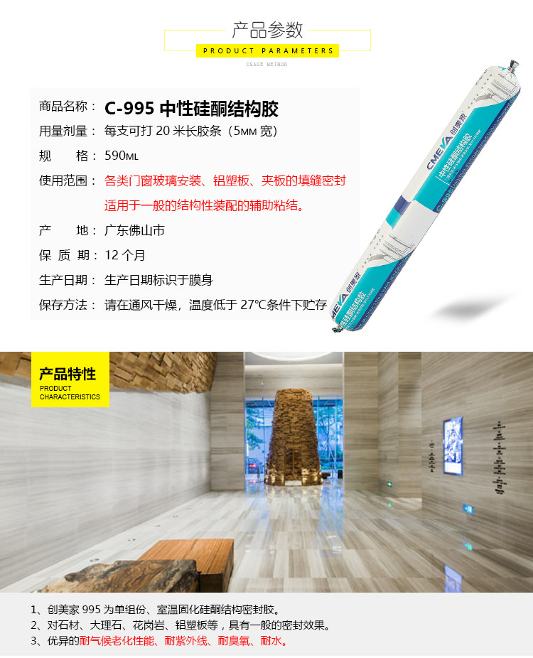 1、創美家C-995為單組份、室溫固化硅酮結構密封膠。